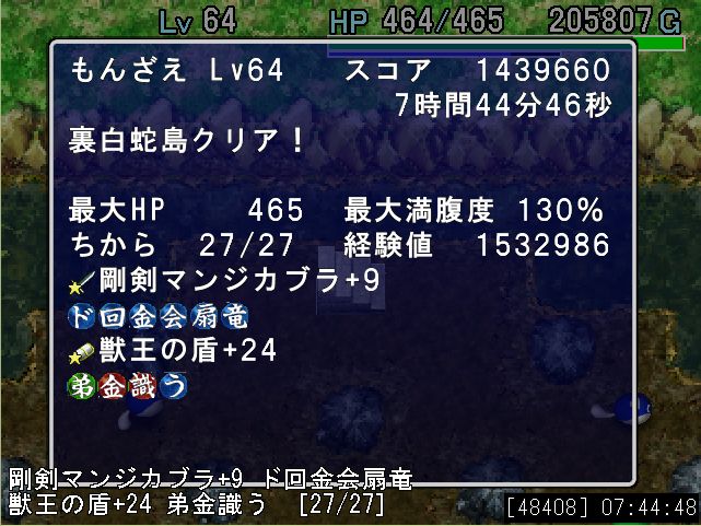 昨日はPC版『風来のシレン外伝 女剣士アスカ見参!』にて さんざん死んで心を折られたので、 今日こそは負けじとダンジョン『裏白蛇』に潜ってきました。 結果がこれ。 8時間ほどかけて、『裏白蛇』4度目のクリア。 いろいろと運の良い冒険でした。 ちなみにプレイヤー名の『もんざえ』は 近松門左衛門の略です。 ここからは自分用メモ。分かる方だけどうぞ。 PR